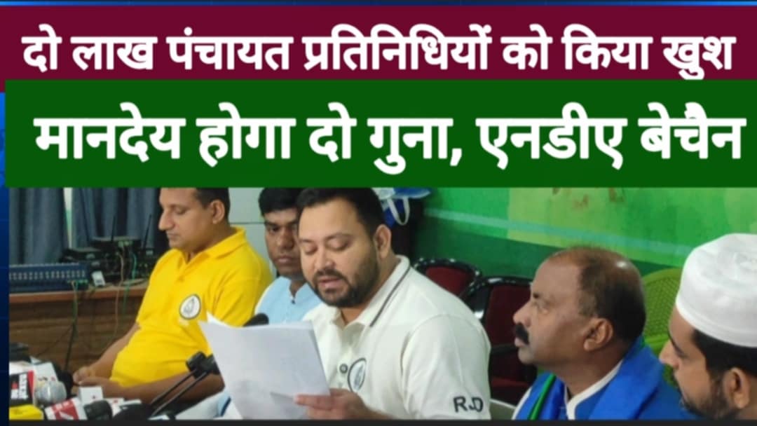 आज तेजस्वी ने ऐलान किया कि पंचायत व ग्राम कचहरी प्रतिनिधियों का मानदेय वह दोगुणा कर देंगे. इतना ही नहीं तेजस्वी ने यह भी कह दिया कि पूर्व पंचायत व ग्राम कचहरी प्रतिनिधियों को पेंशन भी देंगे, सरकार बनने पर.